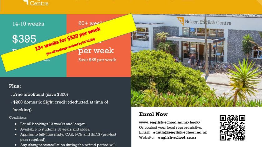 뉴질랜드인들이 가장 살고 싶어하는 도시 1위, Nelson 에 위치한 Nelson English Centre에서 다음과 같은 할인 프로모션을 제공합니다.