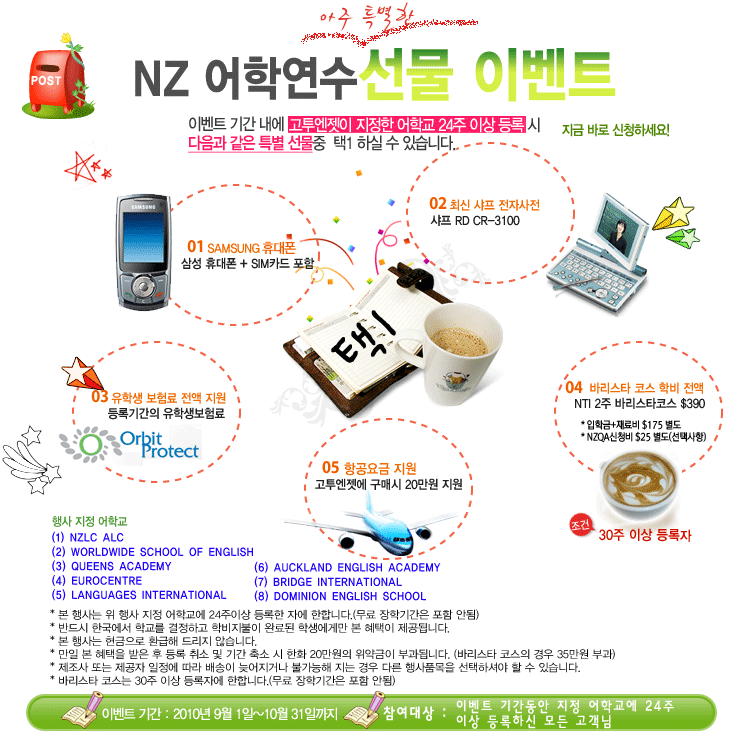 예)) NZLC ALC 신청 시 20주 + 5주 무료 장학혜택으로는 본 행사의 혜택을 받을 수 없고, 24주 + (6주 무료 장학혜택)로 총 30주 이상 등록해야 본 혜택을 받을 수 있습니다.