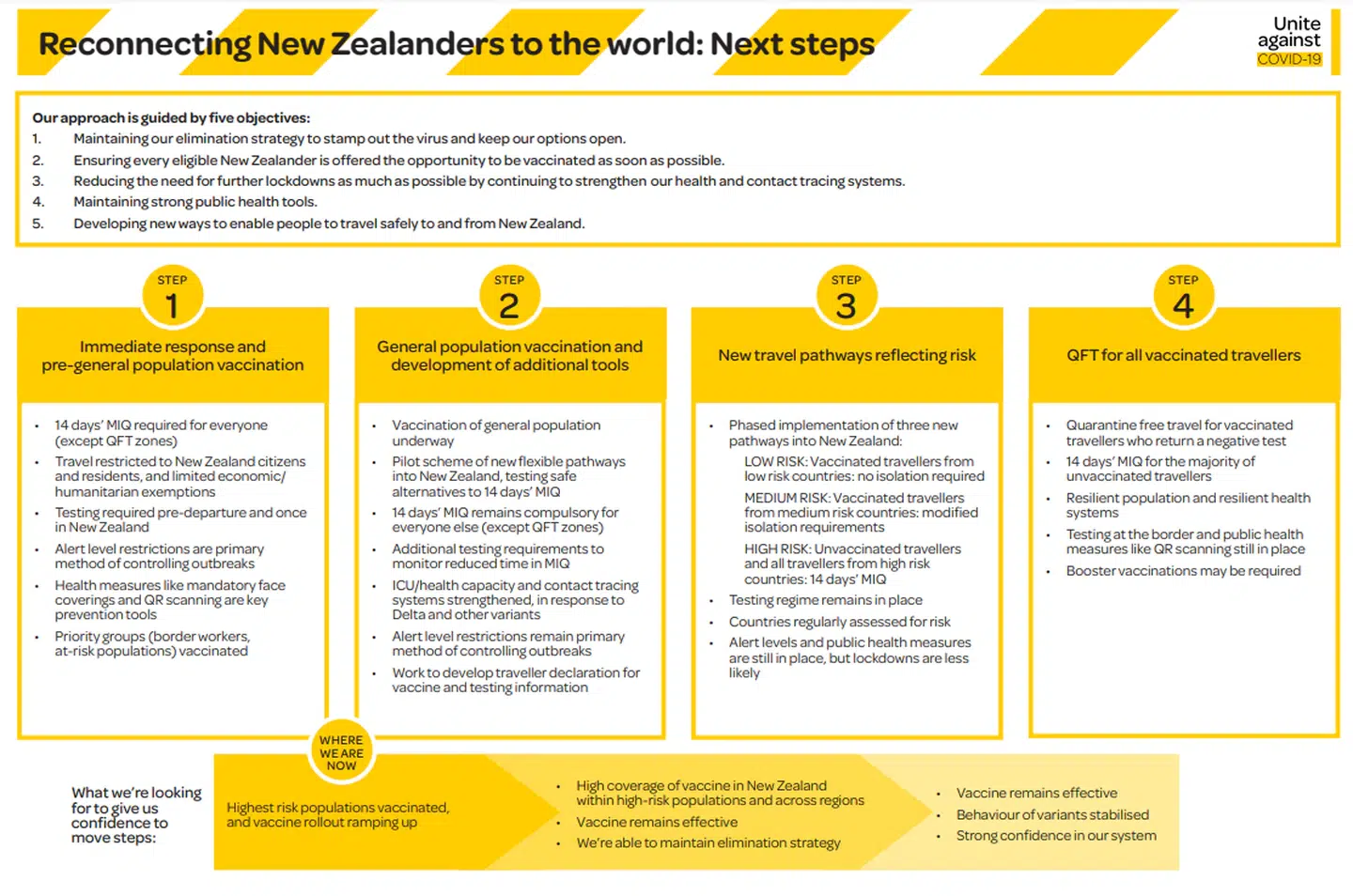 자신더 아던 총리는 대부분의 인구가 예방 접종을 받은 후에도 국경이 단순히 열릴 수 없기에, 전 세계적인 백신 접종 노력이 계속되어야 하고, 다른 많은 국가에서 백신 접종률이 여전히 낮기 때문에 단계적 접근이 필요하다 설명했습니다.